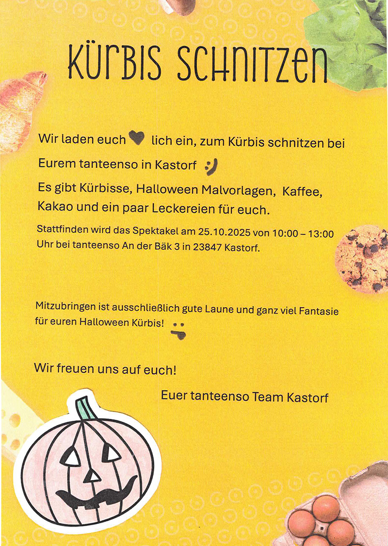 Am 25.10.2025 von 10:00 – 13.00 Uhr findet auf dem Parkplatz von Tante Enso das große Kürbis schnitzen statt.