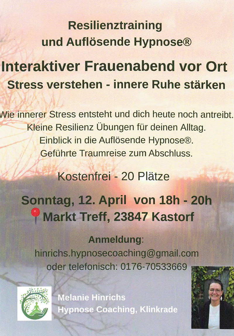 Frau Melanie Hinrichs ist Hypnose Coach für Auflösende Hypnose nach Floris Weber (Arzt und Hypnosetherapeut) und Resilienztrainerin.