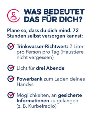 • Was brauche ich, um mindestens 72 Stunden ohne Einzelhandel, Apotheke, Strom und fließend Wasser auszukommen?
