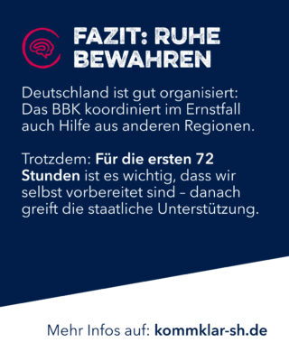 Ein bedeutender Faktor bei der Vorbereitung auf Krisen- und Bedrohungslagen ist die Ei-genvorsorge der Bevölkerung. Um alle Menschen in Schleswig-Holstein zu sensibilisieren und umfassend über diese Eigenvorsorge zu informieren, hat die Landesregierung mit Unterstützung von mehr als 30 Verbänden und Institutionen die Informationskampagne „kommklar_sh“ gestartet. Sie wird landesweit auf Plakaten, auf Werbe- und Informationstafeln und in den Sozialen Medien zu sehen sein und ist für ein Jahr geplant.